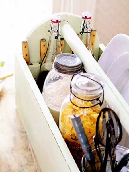 用一个便携式的小篮子或盒子,带提手的那种,来收纳那些在很多地方都容易用到的东西。到什么地方都可以用。