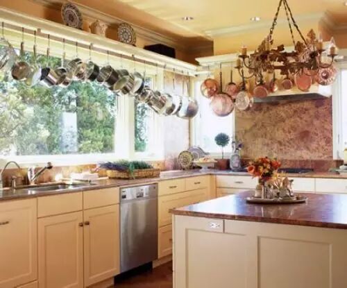 如果墙壁或天花等不能安装挂杆或支架,则可以考虑在橱柜里安一个可抽拉的悬挂式挂杆。用来悬挂勺子、舀子等用具。