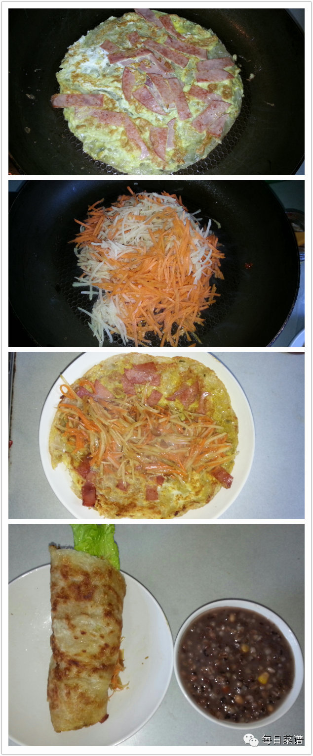在淘宝上买的冷冻手抓饼,吃起来非常方便!从冰箱里取出一张,平底锅刷油放入饼,鸡蛋打散均匀洒在饼皮上,再洒上培根片,翻面烙熟取出即可!胡萝卜丝、土豆丝、黄豆酱、均匀炒熟加在灌饼上,再加上一片生菜,卷好即可!搭配一碗红豆杂粮粥,吃完了小肚子保证舒舒服服的!