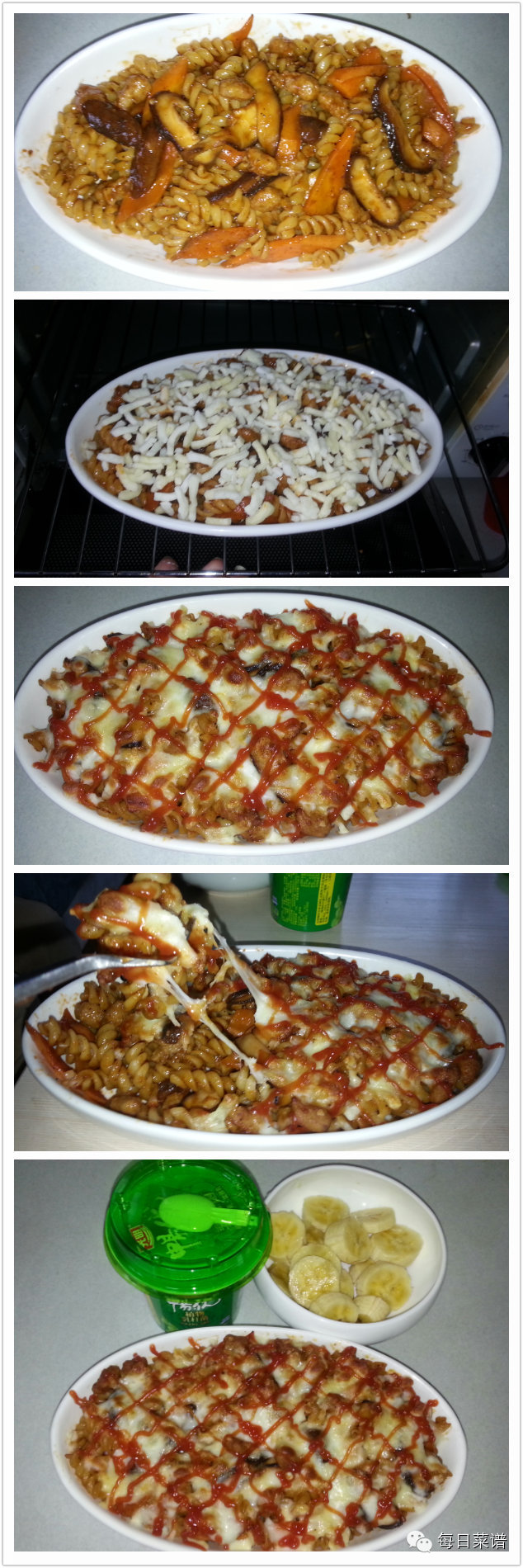 超市买的螺丝面煮熟备用,香菇片、胡萝卜片、黑椒牛肉粒、番茄酱、甜面酱、现磨嘿胡椒一起炒,最后加入螺丝面炒匀出锅!在炒好的螺丝面上码匀奶酪丝,入烤箱上下火220度烤七分钟,挤上番茄酱即可!外加一份香蕉,一杯酸奶,吃的美美的!