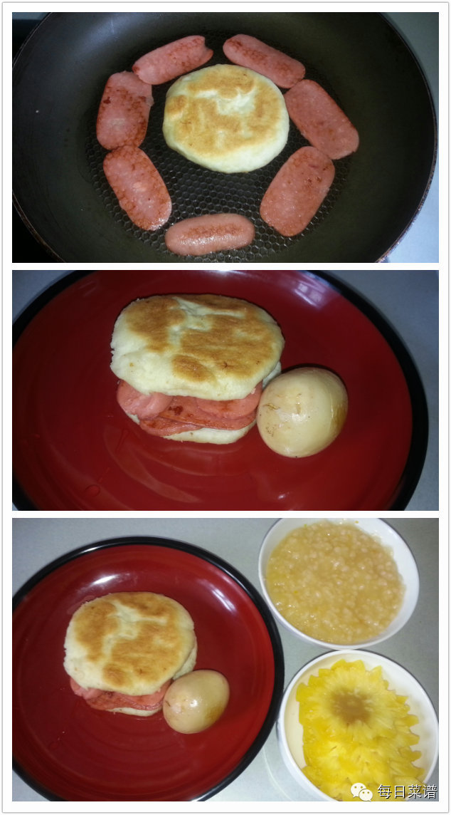 头天买好的烧饼,早晨起来用平底锅热一下,加上煎好的香肠即可,外加一个卤鸡蛋、一碗南瓜粥、一份菠萝!