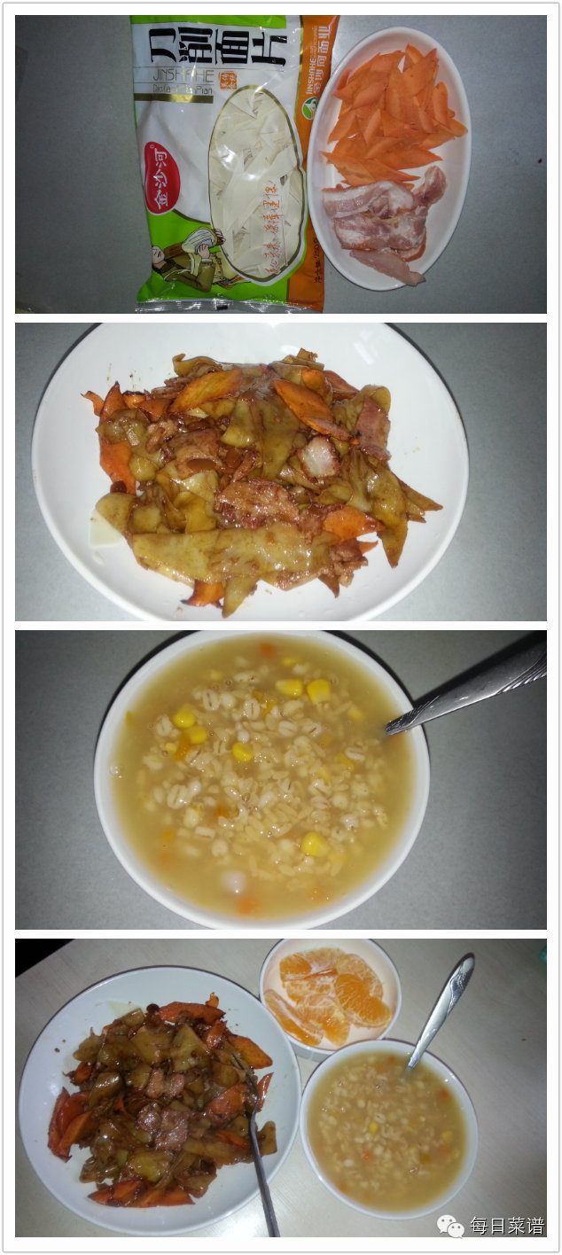 超市买的干面片,煮熟后捞出备用,培根片爆香、胡萝卜片、面片、黄豆酱、均匀炒熟后点香油出锅!搭配一碗玉米燕麦杂粮粥和一份非常败火的丑桔!