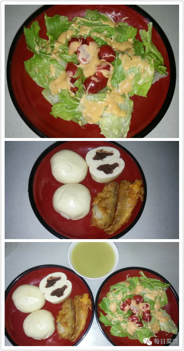 超市买的现成的豆沙包,早晨起来热一下就ok,头天晚上剩的煎黄花鱼两条、一盘蔬菜沙拉、一碗绿豆粥!
