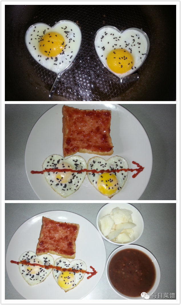 两个鸡蛋用心型模具煎熟,洒上黑芝麻和盐即可,全麦土司抹上草莓果酱,外加一碗红豆粥和一个鸭梨,ok了!