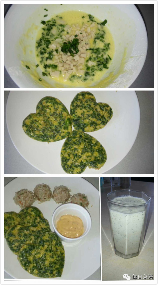 在超市买的心型模具,两个鸡蛋、两勺面粉、菠菜碎、火腿碎、花椒粉、盐、香油,全部搅拌在一起,平底锅及模具刷上油,倒入面糊小火慢慢煎,表面凝固后取下模具翻面煎一下即可!出锅配千岛酱吃!头天晚上吃剩的珍珠丸子,外加香蕉、火龙果奶昔!这两种水果在一起打奶昔是绝配,甜度和口感恰到好处!妈妈们可以试一试!
