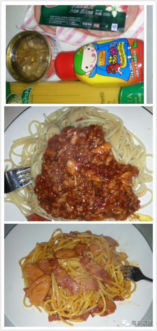 意大利面煮熟捞出,番茄沙司、培根片、猪肉馅、少量盐、均匀炒熟倒在煮好的意大利 面上即可!搭配一杯热牛奶!因为面做的有点儿多,就没在加水果!需要注意的就是一定要用吃薯条的番茄沙司,而非做蛋花汤用的普通番茄酱!两个酱的口味做出 来天壤之别呦!