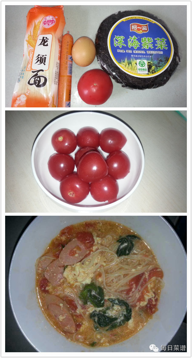 西红柿、火腿肠炒香后加水煮面,快熟的时候洒上鸡蛋液,然后用紫菜、香油、盐、调味出锅!搭配一份圣女果就ok了!