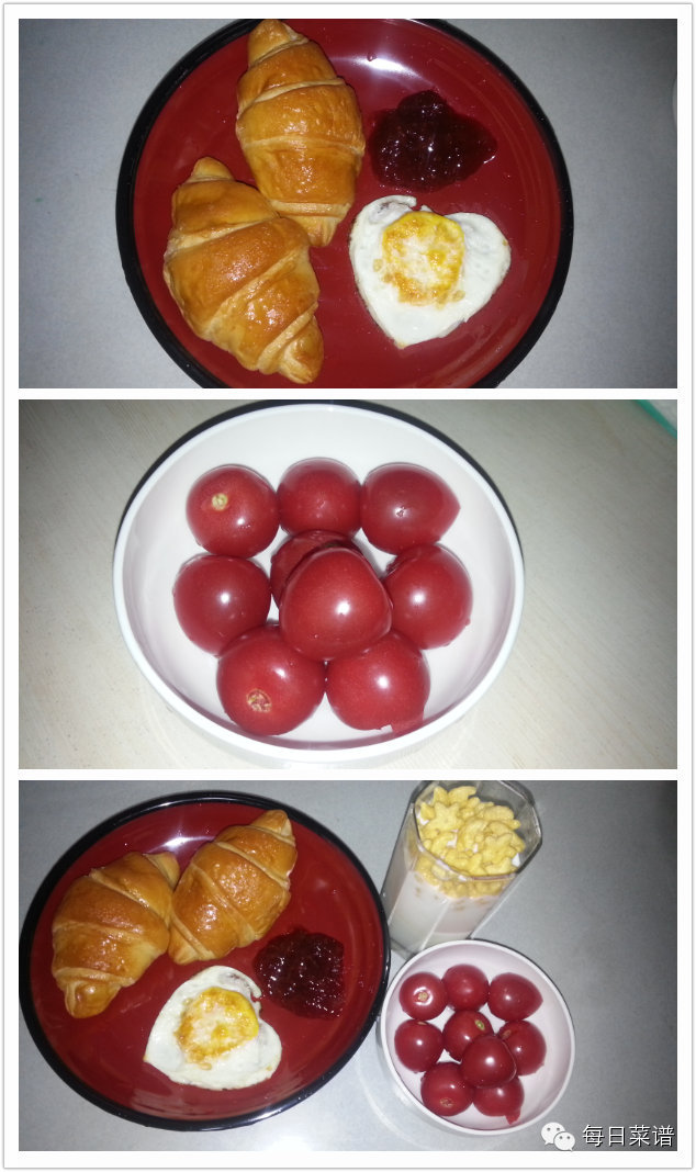 牛角包沾草莓酱,外加一个爱心煎蛋、一杯牛奶脆谷乐、一份圣女果!简单、营养、美味!