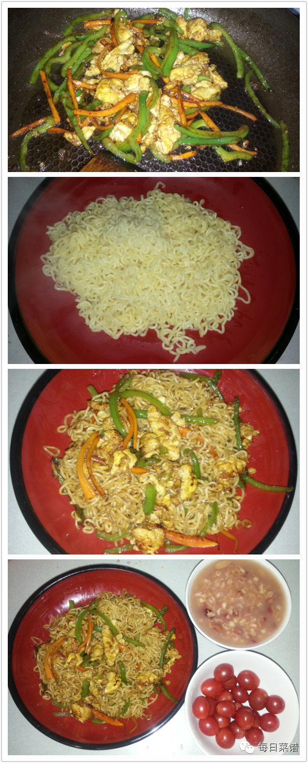 方便面本身是零营养高热量的东西,所以不建议经常给孩子吃,偶尔搭配蔬菜和鸡蛋吃一次倒也无妨!方便面稍微煮一下,跟青椒、胡萝卜、鸡蛋一起炒,最后把方便面自带的调料包都放进去调味,最后淋香油出锅即可,自我感觉炒方便面要比炒普通的面条要好吃很多!配搭一碗红豆粥和一份圣女果很赞了!