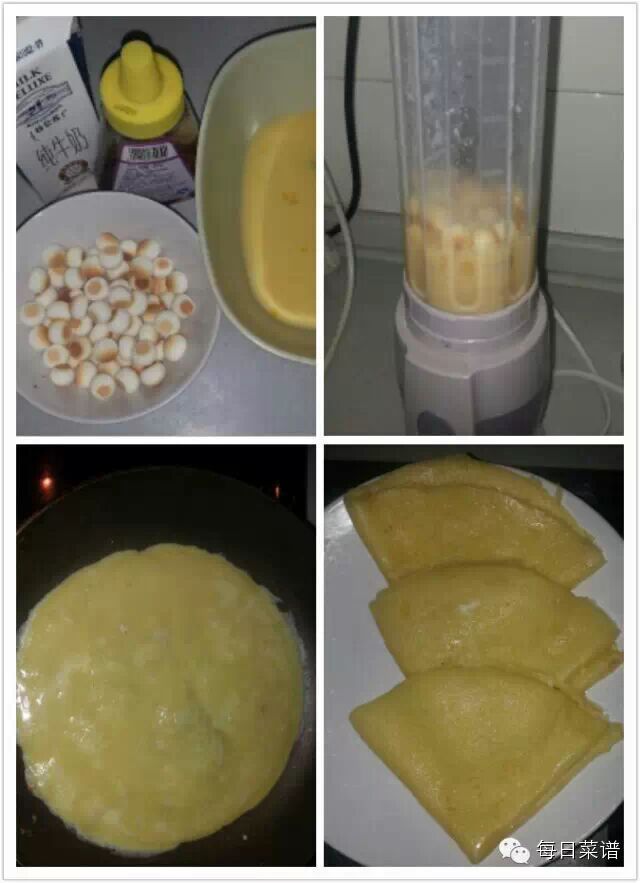 超市买的旺仔小馒头跟牛奶一起打碎,加入白糖和鸡蛋一起搅拌成面糊,平底锅刷油,用最小的火把饼片煎熟,出锅后沾番茄沙司吃!再搭配一杯热牛奶就OK了!需要注意的就是一定要用最小的火,这样煎出来的饼口感又软又Q,非常好吃!