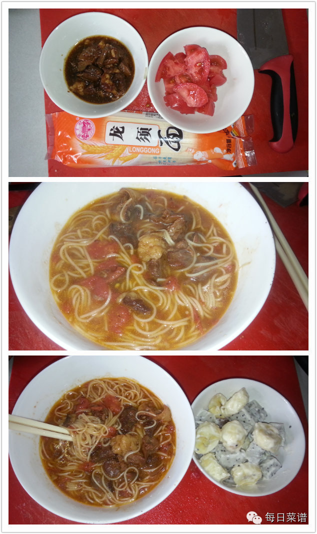 头天晚上剩下的炖牛肉当汤头,西红柿炝锅,炖牛肉和挂面一起下锅煮,盐、鸡精、香油、调味出锅,外加香蕉火龙果沙拉!