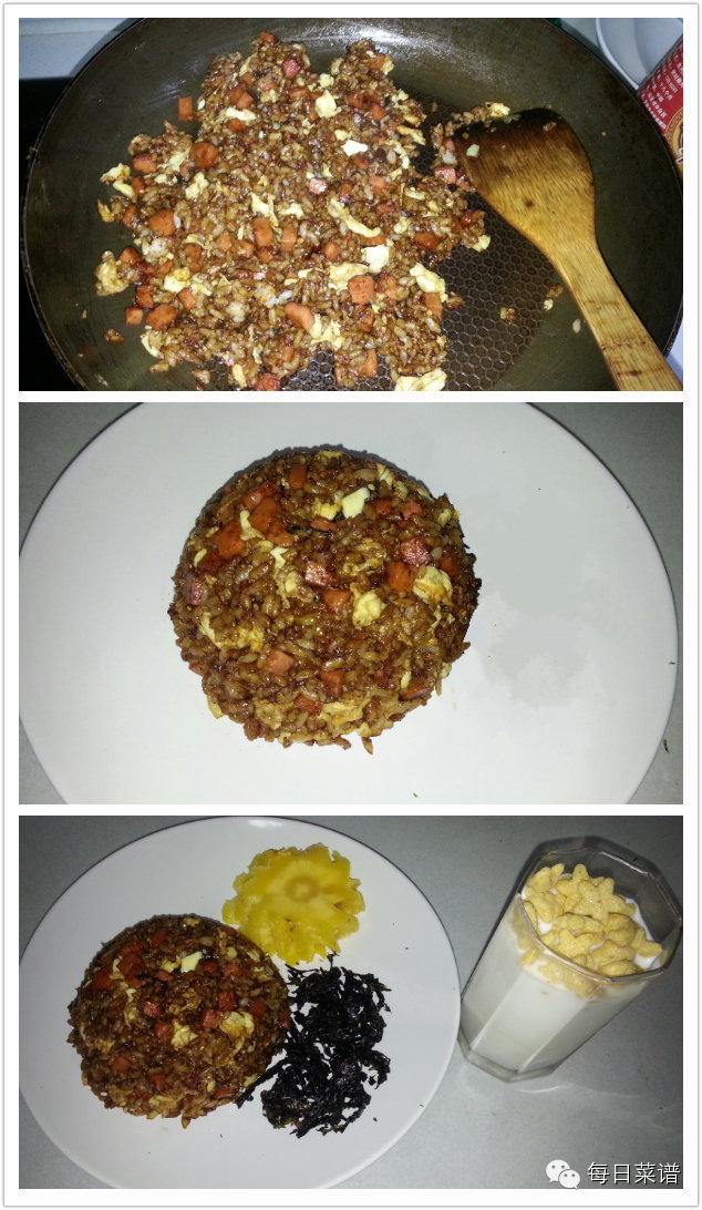 剩米饭、鸡蛋、火腿、酱油、盐、一起翻炒,加香油调味出锅!洒上海苔碎会为米饭加分不少,再搭配几片菠萝和一杯牛奶脆谷乐,营养非常全面了!