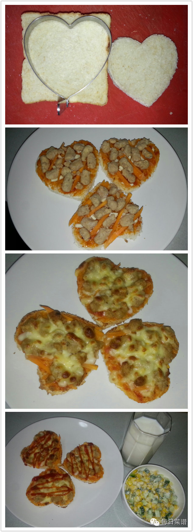 土司切片用模具刻出心型之后,刷批萨酱,洒胡萝卜丝、牛肉粒、马苏里拉奶酪,烤箱预热220度,上火上层烤5分钟!再搭配一份西瓜和一杯香蕉奶!