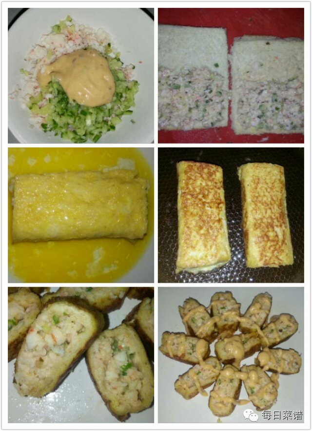 两片土司,切边后用擀面杖擀实,虾仁煮熟后剁碎,黄瓜碎、千岛酱、点点盐、香油、搅拌成馅料,码放在土司的半边,两边合拢后用蛋液封口并压实,整个土司均匀裹上鸡蛋液后,平底锅刷油放入土司小火煎至金黄色,出锅切段洒上千岛酱即可!搭配一杯热牛奶!这款早餐虽然复杂一些,但是却值得尝试,因为真的非常好吃!