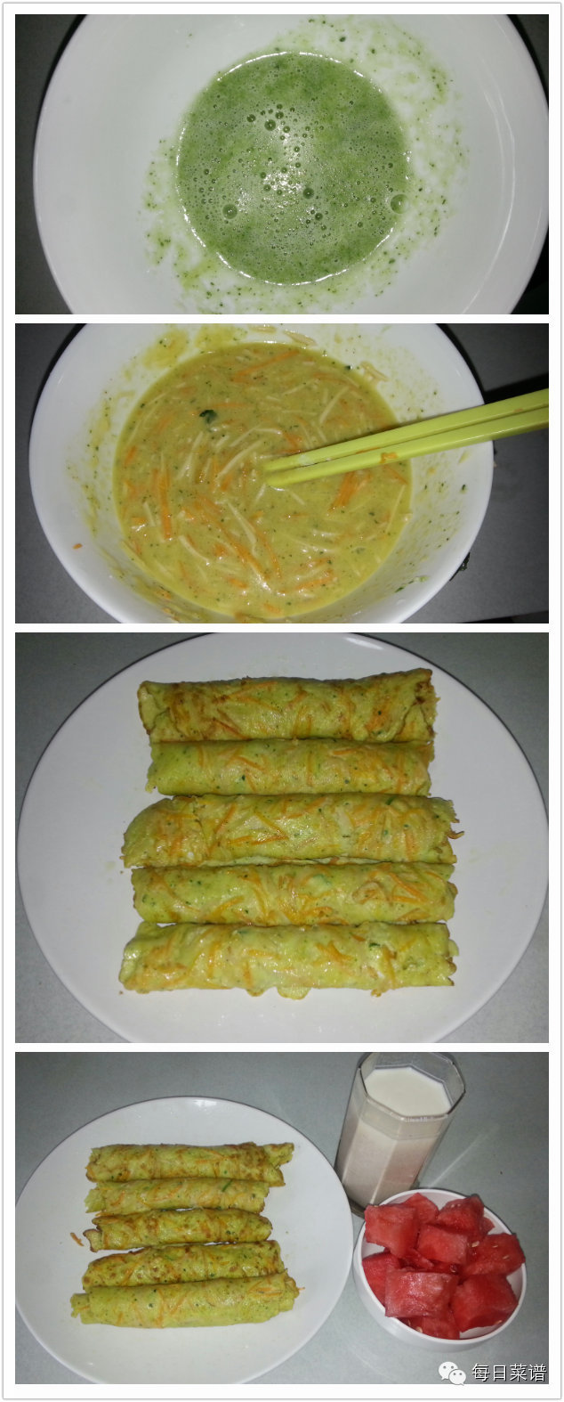 黄瓜打碎、两个鸡蛋、一把面粉、胡萝卜丝、火腿丝、花椒粉、盐、香油、搅拌成面糊,平底锅小火摊成薄饼,出锅后卷起!牛奶放入豆沙馅加热后搅匀,再搭配一份西瓜!就ok了!