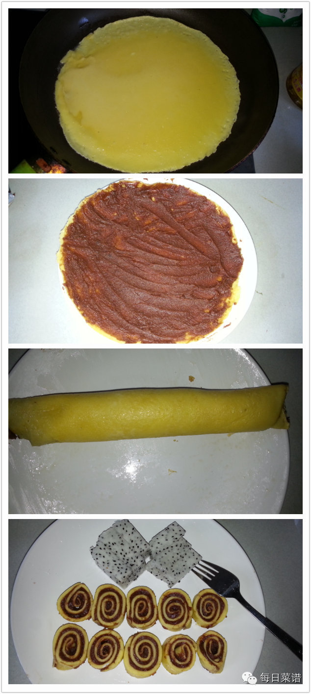 鸡蛋、面粉、白糖调成面糊,平底锅刷油小火摊成蛋饼,豆沙陷加牛奶调稀一点儿,太稠不容易抹开,抹好豆沙馅的蛋饼卷起来切段装盘就完成了!牛奶加燕麦片加冰糖微波炉里叮两分钟即成了美味又营养的牛奶燕麦粥!