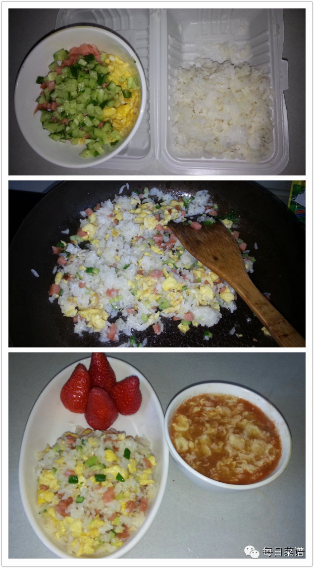 剩米饭、黄瓜丁、火腿丁、鸡蛋碎、葱末一起翻炒、最后用盐、香油调味出锅,外加一碗番茄鸡蛋汤和四颗草莓!早晨如果不想起太早,头天晚上可以把黄瓜火腿都切好,鸡蛋炒好,早晨起来简单一炒就ok了!