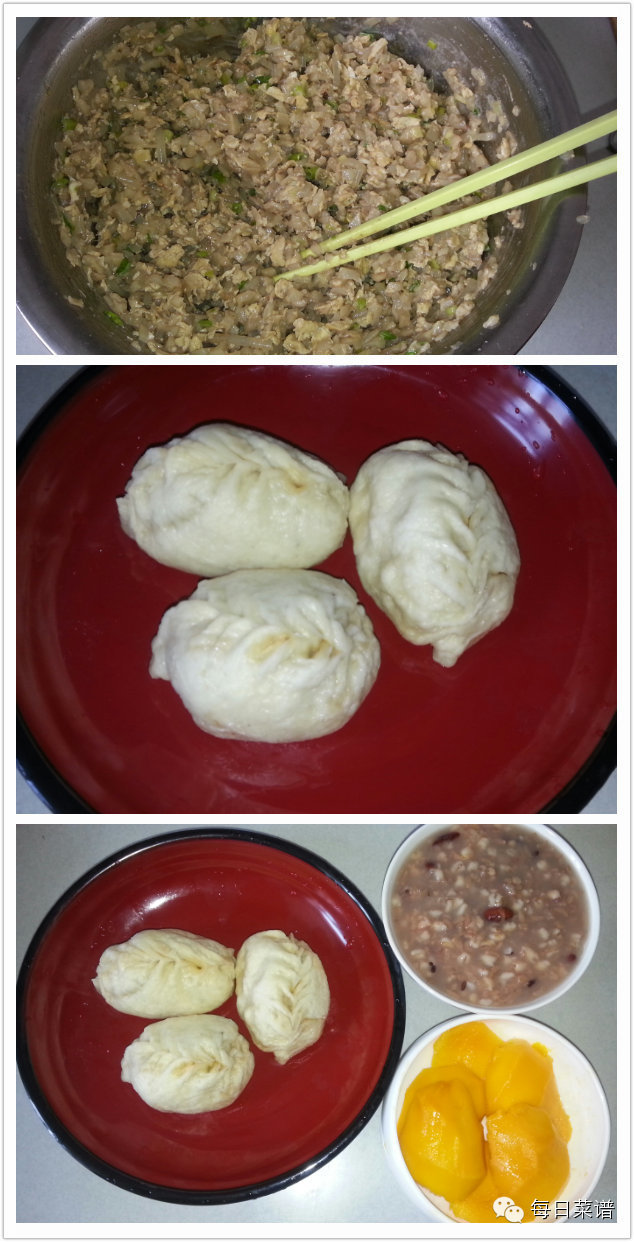 头天晚上蒸的素包子,早晨起来热一下就ok了,搭配一碗八宝粥和一份芒果!