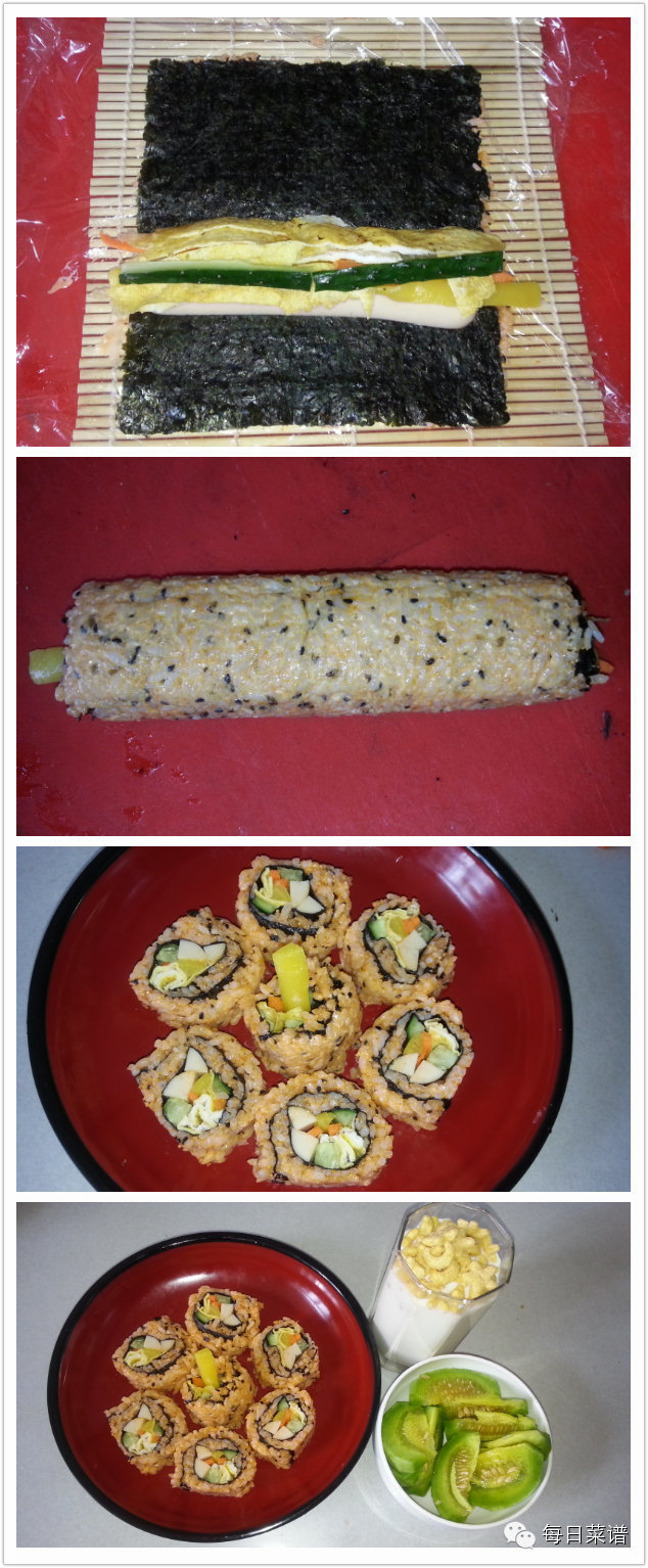 温热的米饭用芝麻、香油、盐拌好,均匀铺在紫菜上,把香肠、黄瓜、胡萝卜、甜萝卜、鸡蛋片、蟹棒码放在铺好的米饭上,用珠帘卷起切段即可!搭配一碗小米粥、一份西瓜!头天晚上睡觉前做好也可以,这样就不用早起了哦!