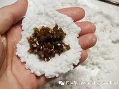 9.慢慢的把周边的皮包起来,裹成一个丸子。如果包不上没关系,可以继续补西米,因为粘性比较强,所以看到那里漏了,补上几粒西米,再搓圆就行了;