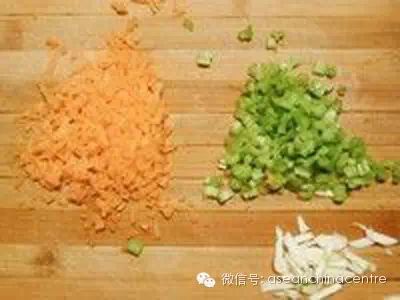 1.将香芹、胡萝卜、洋葱、蒜,全部切成碎末;