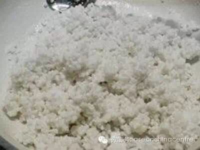 6.趁着这个时间做西米外皮,将西米放入一个大碗中,将热水缓慢的倒入,并一边倒一边搅,保证所有的米粒能粘到热水。不要一次倒入,先倒入7、8成,然后用手摸一下,感觉一下西米是不是能粘在一起,如果不行的话再继续倒水。注意水别倒多了,只要能保证米能粘在一起就行了;