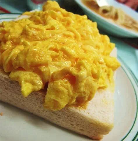 一直抖动手腕,将在油里氽了一会儿的蛋一直打进旁边的盘里。蛋液到了盘中,盘成了一圈,在余温的作用下,才渐渐凝成了型。一时间,香气四溢,金黄透明的炒蛋冒着热气,还在微微颤动。