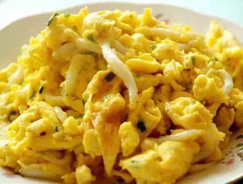 打鸡蛋很关键,打鸡蛋的时候一定要力道足够,顺一个方向搅打,打至鸡蛋全部呈现白色泡沫状,同时加点绍酒搅匀,味道更佳。鸡蛋打不好,炒出的鸡蛋发硬,不松软,还显得量少。也可以加少许水(几滴),使鸡蛋变的酥软。