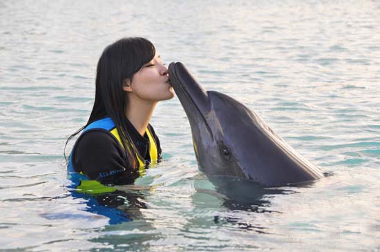 她在海洋公园和海豚接吻的摄影照片,让我羡慕死了。