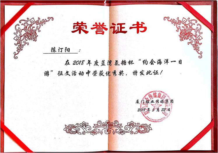 2018.5,23参加厦门报业集团主办的蓝湾氨糖杯“约会海洋一日游”颁奖仪式,有感赋之。