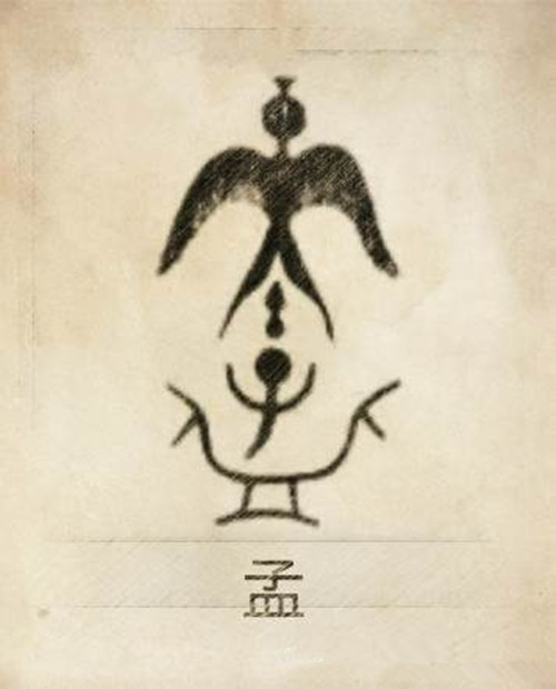 孟姓图腾,燕子或“金乌”所生之族。孟是玄鸟族一支子姓的族称。上部分是玄鸟殒卵生子,下部分代表接纳的意思。传祖为鲁庄公庶兄庆父共仲,以孟为氏,转为姓。起源主要有三:①出自姬姓,源于春秋鲁国公族,始祖庆父,以祖上排行为氏。②出自姬姓,卫国(今河南一带)公孟氏之后,以祖字为氏。③出自少数民族。始祖:孟轲。