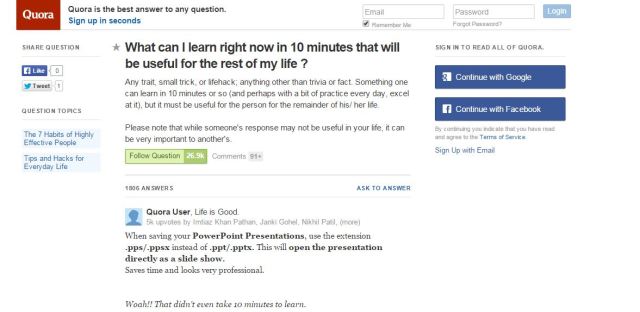 美国问答网站Quora上有个持续火爆的问题:“What can I learn right now in just 10 minutes that could be useful for the rest of my life?”(有什么是十分钟就能学会,但是能受益一生的技巧?)