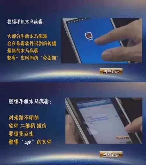 二、如何防范手机中毒?记住,对于来路不明的软件、二维码,尤其是别人发过来的短信还带着链接,一定要警惕又警惕,轻易不要点。如果遇到后缀名是“.apk”的文件,切记,更不要碰;