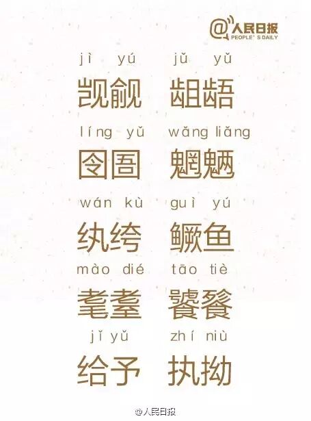 觊觎jìyú、龃龉jǔyǔ、囹圄língyǔ、魍魉wǎngliǎng、纨绔wánkù、鳜鱼guìyú、耄耋màodié、饕餮tāotiè、踟躇chíchú、倥偬kǒnɡzǒnɡ……这些词是不是总觉得会读,却又读不对?戳图自测,100个字,你能读对几个?邀请小伙伴一起来挑战!