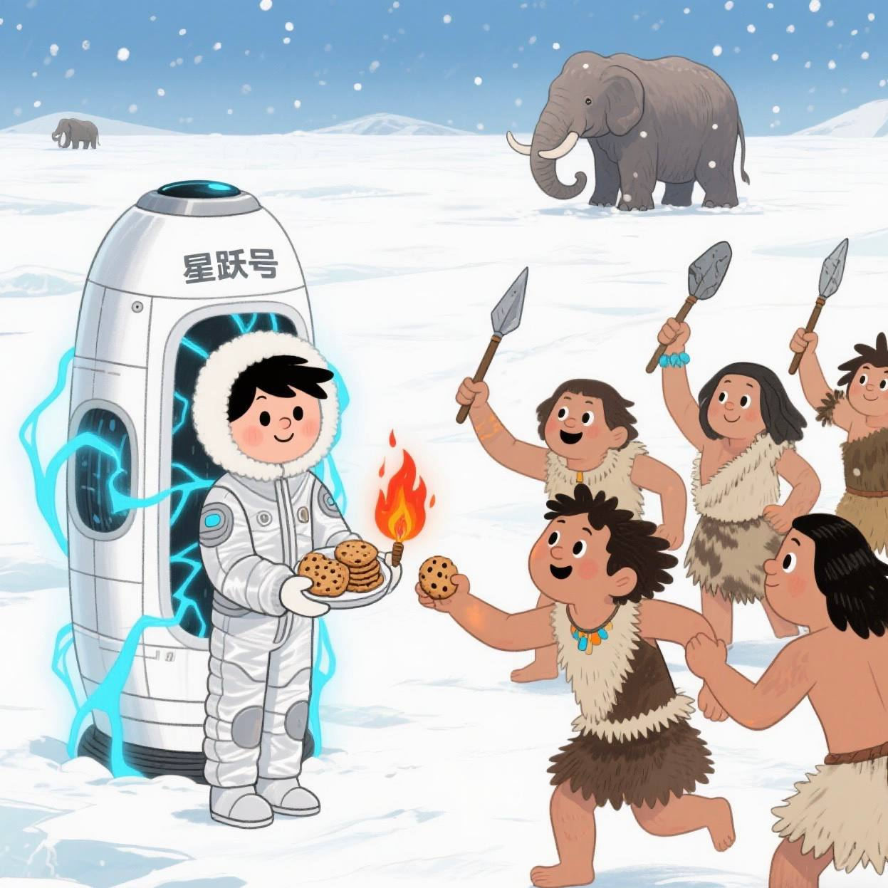 眼前是白茫茫的冰原,巨大的猛犸象像会移动的山丘,每一步都震得雪地簌簌发抖。我赶紧裹紧特制保暖衣,恒温系统立刻隔开零下四十度的严寒。突然,一群身披兽皮的原始人举着石矛围住我,粗糙的脸上满是警惕。我连忙打开纽扣翻译器,滋滋电流声后传出他们的语言:“别怕,我是朋友!”又递上能量饼干和永不熄灭的电子火种。跳跃的橙红火光映亮他们好奇的眼睛,冻僵的手指小心地触碰温暖的火焰。