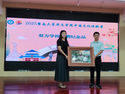 激动人心的结业证书颁发环节紧随其后,暨南大学华文学院数智华文协同创新中心副主任林奕高、培训部主任颜婷婷亲自为全体营员颁发“文化体验营学习证明书”, 肯定了孩子们的努力与成长。学员们依次上台,郑重接过象征学习成果的证书,脸上洋溢着自豪与喜悦。随后的双方互赠纪念品仪式,更是将中缅两校间的情谊具象化,精心准备的礼物承载着深深的祝福与对未来持续合作的期盼,也为这段旅程画上了圆满的句号。