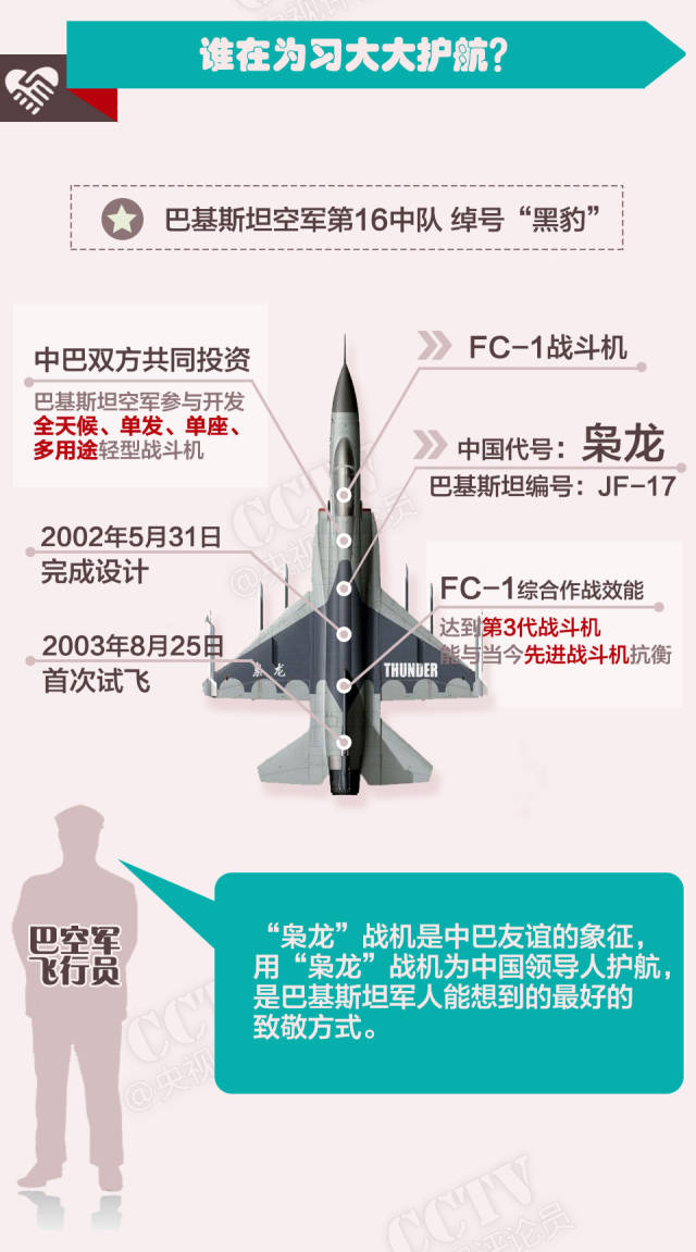 今天,习近平主席离京出访巴基斯坦。当习近平主席的专机进入巴基斯坦境内时,巴空军出动8架枭龙战斗机为中方护航。........