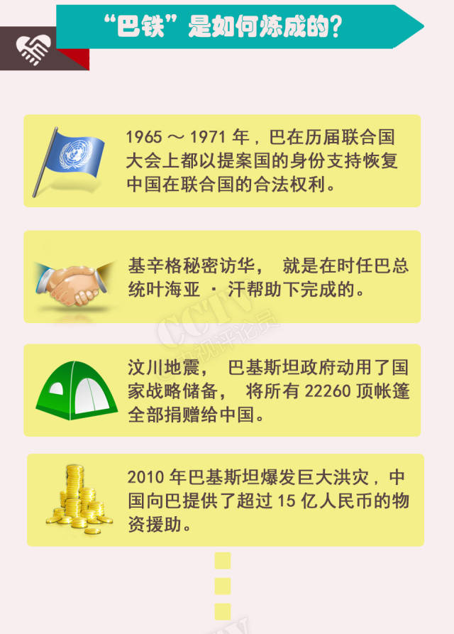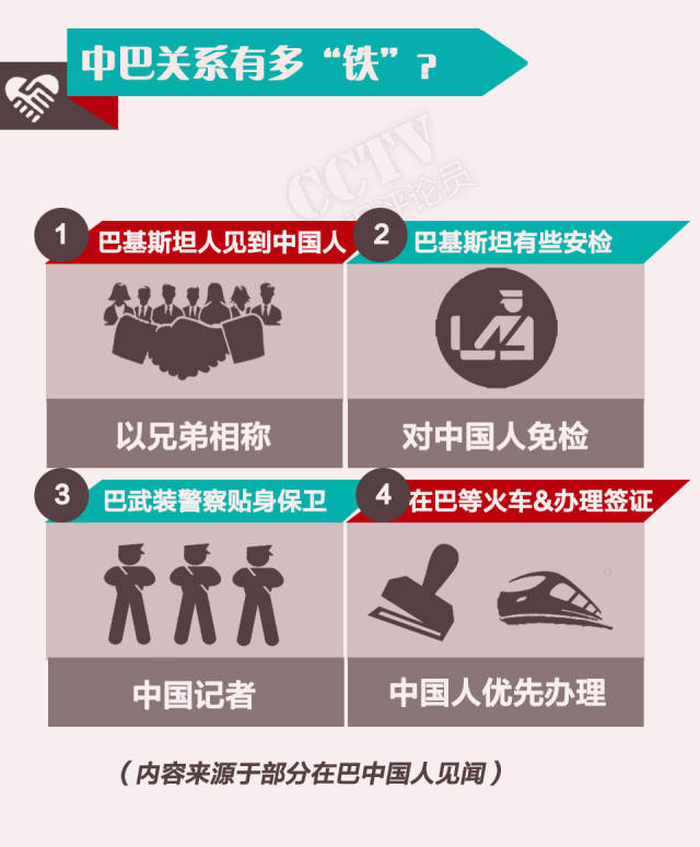 .巴方高规格接待,自然是因为中巴两国的“铁哥们”关系。国人喜欢亲切地称巴基斯坦为“巴铁”;巴基斯坦人则习惯用“比山高、比海深、比蜜甜、比钢硬”来形容巴中友谊。中巴友谊有多“铁”?看看这些你就知道了——