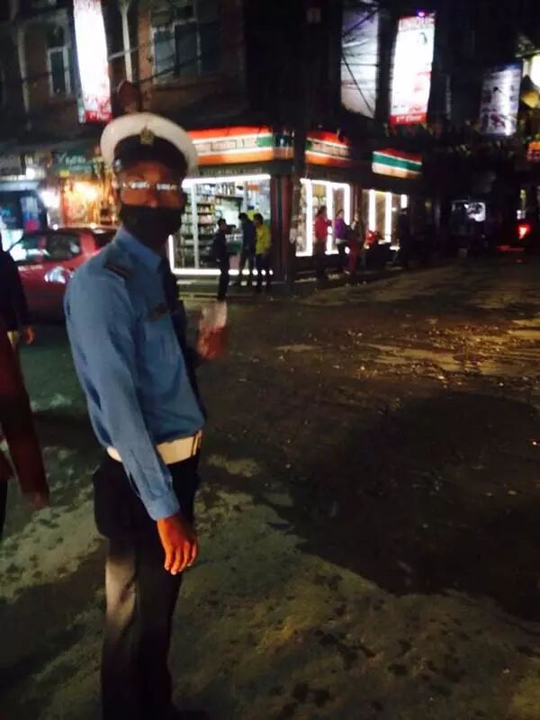 在街角的尽头,在这个还没有红绿灯的国度,尼泊尔警察戴着黑色的口罩孤独地站在拥堵混乱的车海中,形单影只。