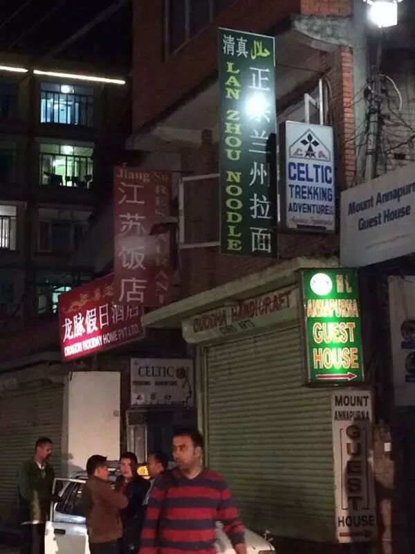 在加德满都的旅游中心泰米尔,写满中文的标语贴在一家家贩卖鲜艳披肩毛毯的店门口,商贩们操着蹩脚的中文对来往亚洲面孔狡黠地喊着“你好,进来看看。”;川菜、兰州拉面、东北菜馆鳞次栉比;堆满了中国商品的小超市,兜售着与国内价格不相上下的泡椒凤爪、花生、饮料、牙膏、洗发水,而这些产品的生产日期也普遍在3-4个月内;人民币在这个异域国度受到热捧,神秘的上海老板开着中餐馆,雇佣着尼泊尔“总管”负责货币兑换。