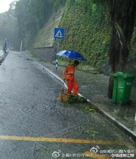 @福建身边事:昨天下午十五点左右在龙腰公交车站,又看到了那位背着大雨伞的环卫工,因穿着红色工作服在暴风雨中显得特别显眼,全身湿透的他仍坚持将残枝断叶清扫干净,以保持水流畅道