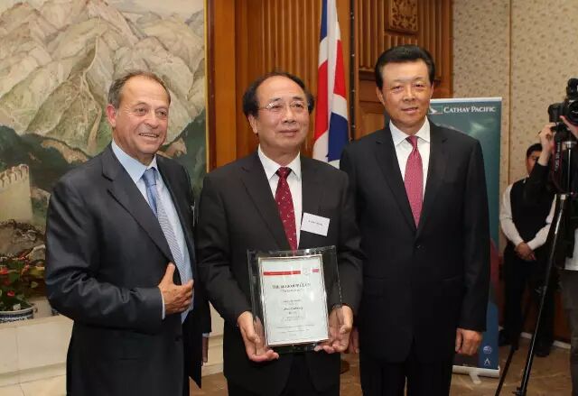 4月26日,在英国伦敦,获得“破冰者”奖的中国全国政协外事委员会主任赵启正(中)与英国48家集团俱乐部主席斯蒂芬·佩里(左)和中国驻英国大使刘晓明在颁奖典礼上合影。新华社记者 殷刚 摄影