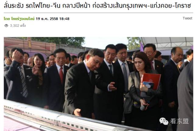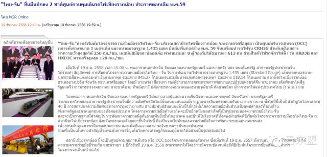 12月19日,泰国泰叻报发表了题为 《启动!中泰铁路明年中旬力争全线开工》的文章,文中提到:依照设计规划,中泰合作修建的这条铁路线为人字形铁路线,中泰铁路合作项目启动仪式当日在泰国大城府邦芭茵县清惹克侬火车站举行。中泰铁路合作项目包括修建廊开—呵叻—坎桂—玛塔卜和曼谷—坎桂铁路。该线路设计时速180公里,预留时速250公里提速条件,将全部使用中国技术、标准和装备。投资总额为5000亿泰铢。相对之前原有的铁路系统,中泰铁路的速度已经提升巨大。对于之前的汇率问题,交通部一直请求中国降低原定的2.5%的幅度,并认为不应高于2%,建设方面泰国负责电力系统,中方负责铁路铁轨、信号系统、通讯系统、动力系统