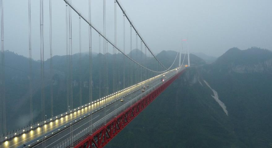 矮寨特大悬索桥位于中国湖南省湘西州吉首市矮寨镇境内,距吉首市区约20公里,是国家重点规划的8条高速公路之一——长沙至重庆通道湖南段吉(首)茶(峒)高速公路中的重点工程。工程为双层公路、观光通道两用桥梁,四车道高速公路特大桥。桥型方案为钢桁加劲梁单跨悬索桥,全长1073.65m,悬索桥的主跨为1176m,创造了四项世界第一,极大地改善湘渝两省市的交通现状,对两省市乃至中西部的对接具有极其重要的意义。