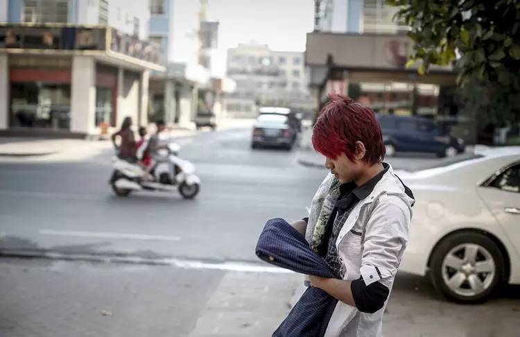 染着红色头发的缅甸人,在洗车行外晾晒毛巾。