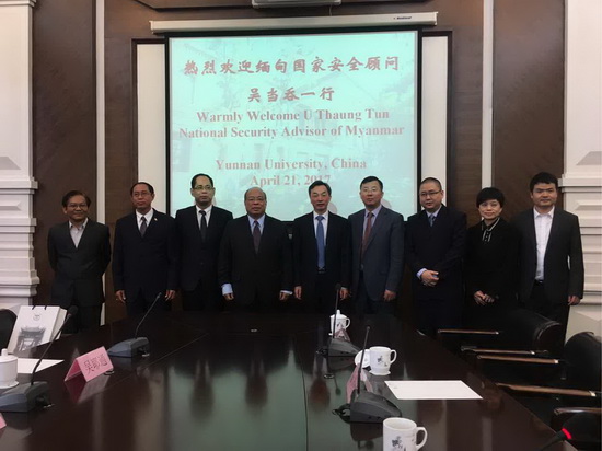 4月21日,缅甸国家安全顾问吴当吞一行到访云南大学,与我校国际关系研究院、周边外交研究中心、缅甸研究院的学者举行座谈交流。出席会议的缅方人员有缅甸国家安全顾问吴当吞、缅甸外交部计划和行政司司长梭林汉、缅甸国家安全顾问办公室处长漆温、缅甸驻昆明总领事吴梭柏,以及云南大学缅甸研究院访问学者吴耶通。中方人员有云南大学副校长杨泽宇教授、国际合作交流处副处长兼孔子学院办公室主任吴芸教授、缅甸研究院院长李晨阳教授、缅甸研究院常务副院长孔建勋教授,以及来自国际关系研究院、缅甸研究院的师生,会谈由李晨阳教授主持。