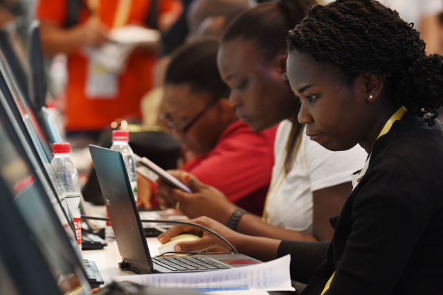 9月2日,在金砖国家领导人厦门会晤新闻中心,几名来自非洲的记者在工作。 新华社记者宋为伟摄