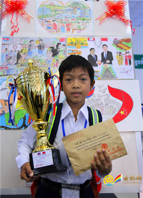 来自金边市Toul Toppoung小学的11岁男孩DARA VATANAK获得了绘画比赛的一等奖,他说:“从小妈妈就告诉我,中国帮助我们柬埔寨建设了很多的道路桥梁和高楼大厦,我想把这些都画下来。”