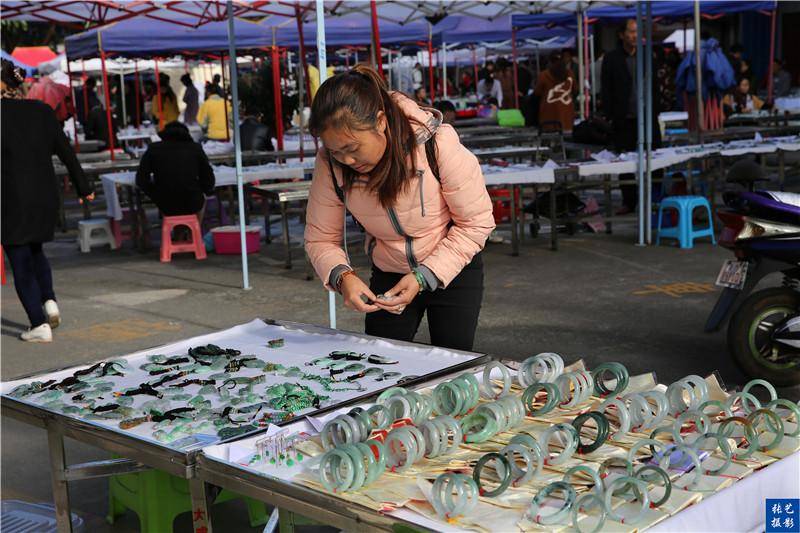 腾冲的玉石交易市场就在腾冲的县城里,每五天有一个集日(每月1号、6号、11号、16号、21号、26号),完全是开放式的摆地摊,有很大的随意性。这里的经营人员既有腾冲本地人,也有来自缅甸的异国玉器商贩,还有全国各地来赶集与采买人员。