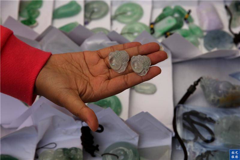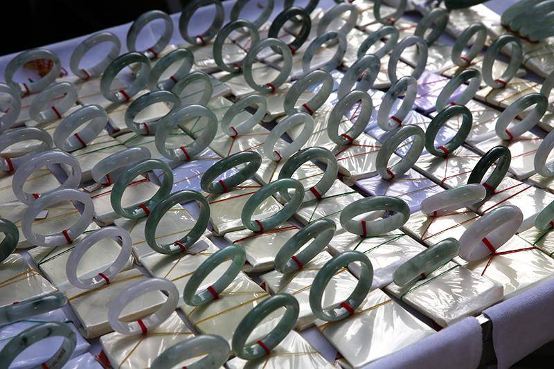 懂行的当地朋友小丹拿起一些手镯讲给我听,“这些都是涂了抛光粉的,上面再挂胶,外表看有翠也很漂亮,但遇到水就会褪色的”。
